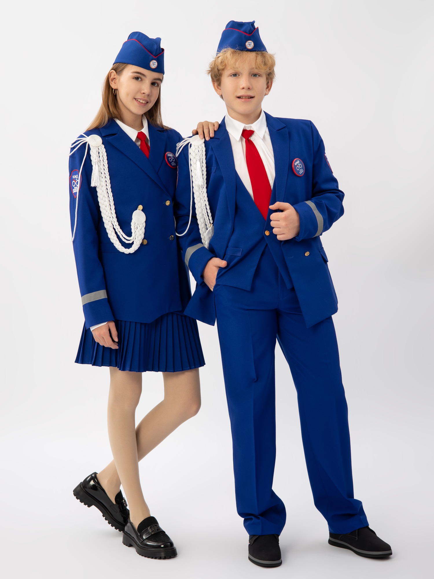 - Китель: двубортный пиджак с подкладкой, прямой крой;